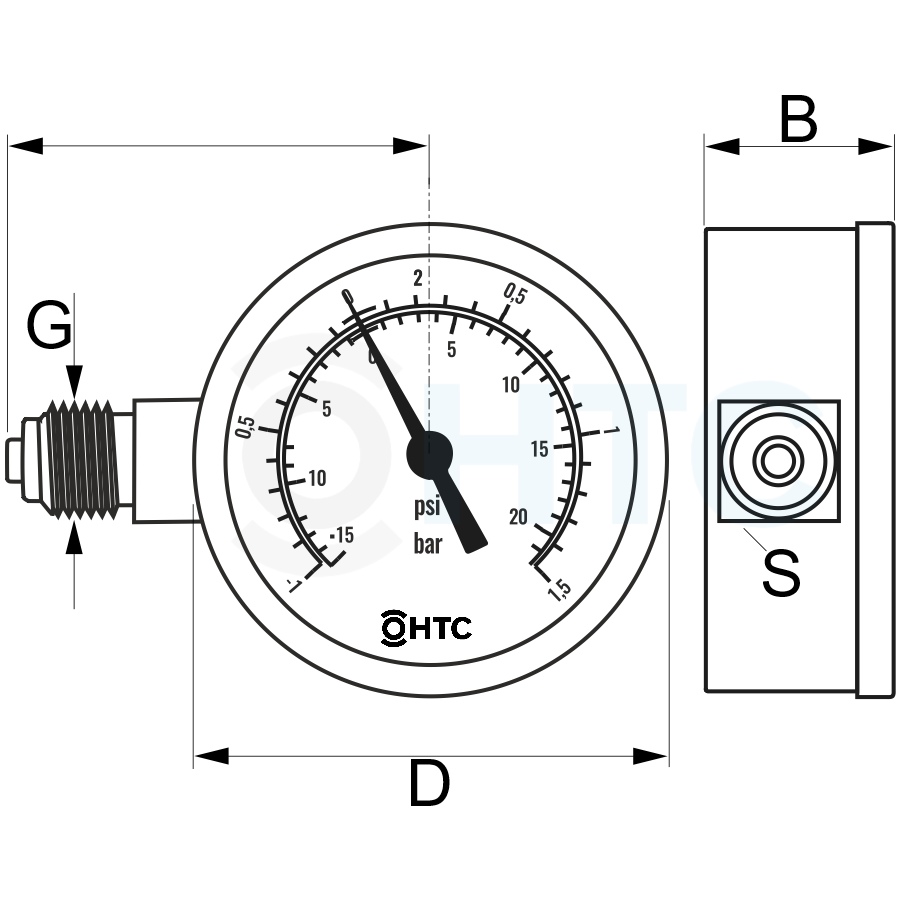 HTC© Manometer 2" Außengewinde -1 - +1,5bar Trocken seitlich links 1/4"